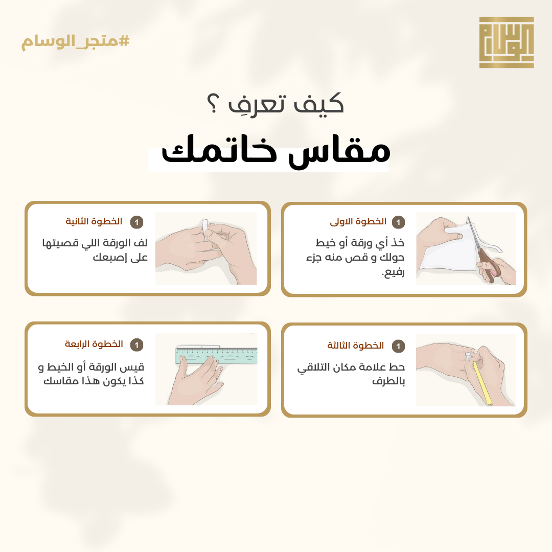 ملحوظة لعملاء الوسام : اختيار المقاس المناسب للخاتم يضمن لكِ راحة وأناقة مثالية. في هذا الدليل المصور، نوضح لكِ أسهل طريقة لمعرفة مقاس إصبعك باستخدام أدوات بسيطة في البيت.